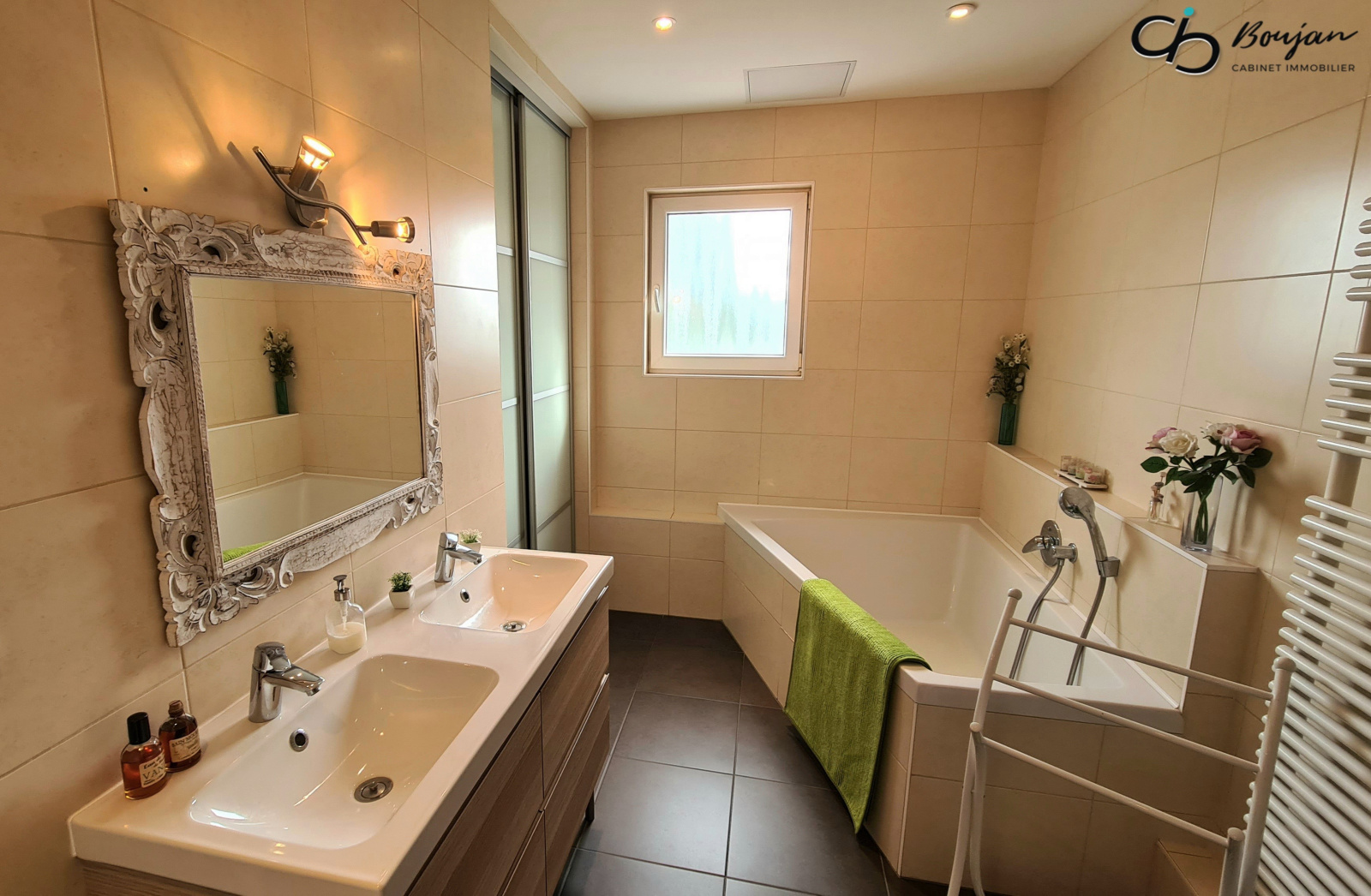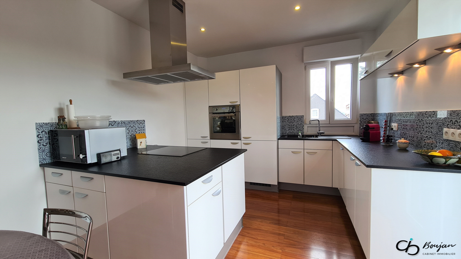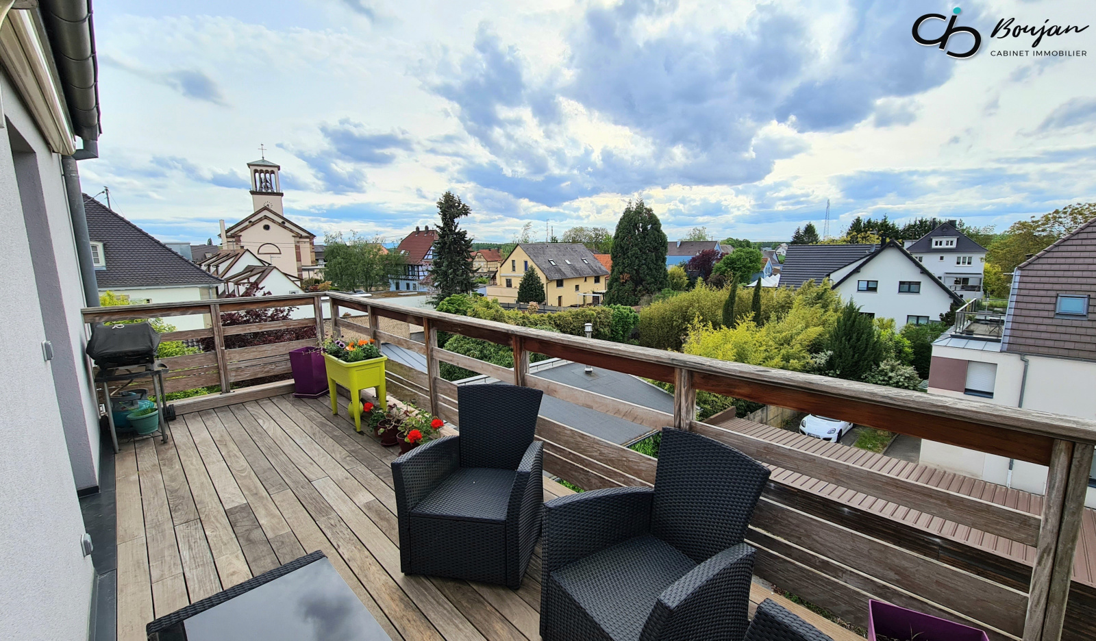 Au 1er niveau, une cuisine équipée avec îlot s’ouvre sur une pièce à vivre très lumineuse de 35 m², cette dernière donne accès à une terrasse de 13 m² bénéficiant d’une vue dégagée sur La Wantzenau et son église. Un couloir avec rangements dessert trois chambres spacieuses, une salle de bain avec baignoire et douche ainsi qu’un WC séparé suspendu complètent ce niveau.