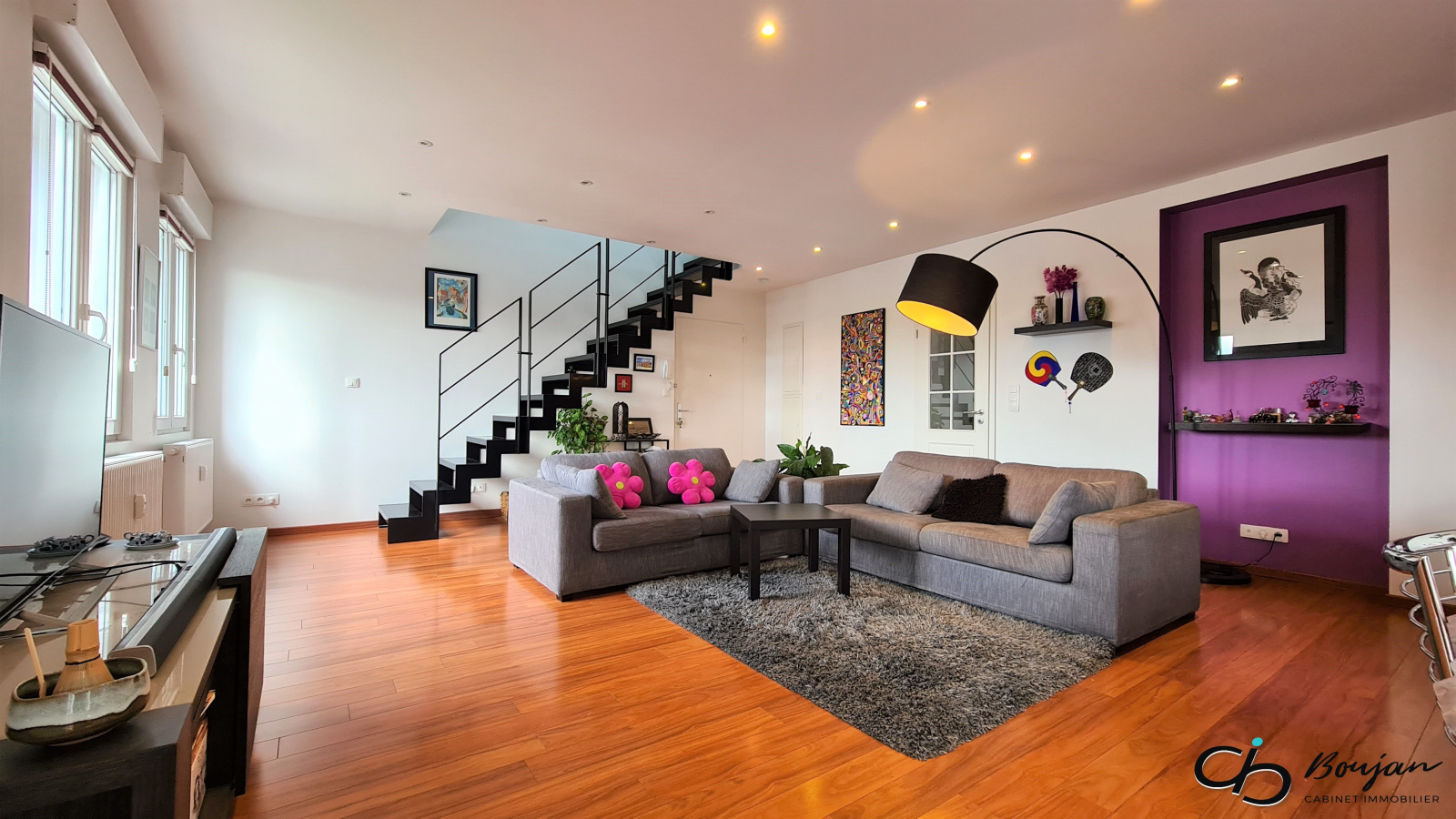 Au deuxième étage d’une bâtisse de 1957 entièrement rénovée, superbe duplex 6 pièces de 135,09 m² loi Carrez alliant charme de l’ancien et modernité.