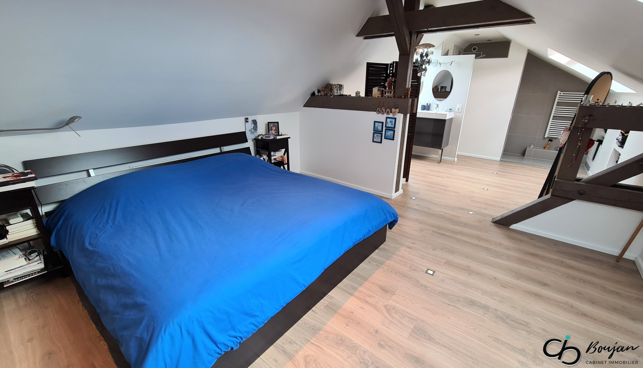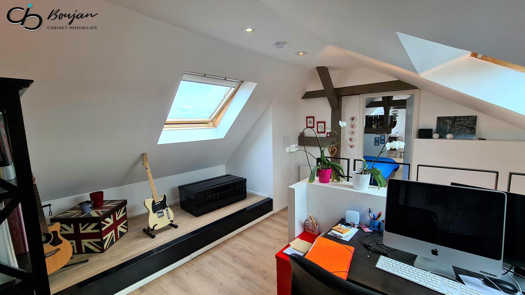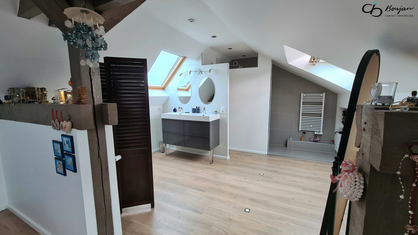 A l’étage vous découvrirez une mezzanine aménagée en bureau ainsi qu’une magnifique suite parentale ouverte sur une salle de bain avec douche à l‘italienne et WC. De nombreux rangement sous pentes ont été astucieusement aménagés.