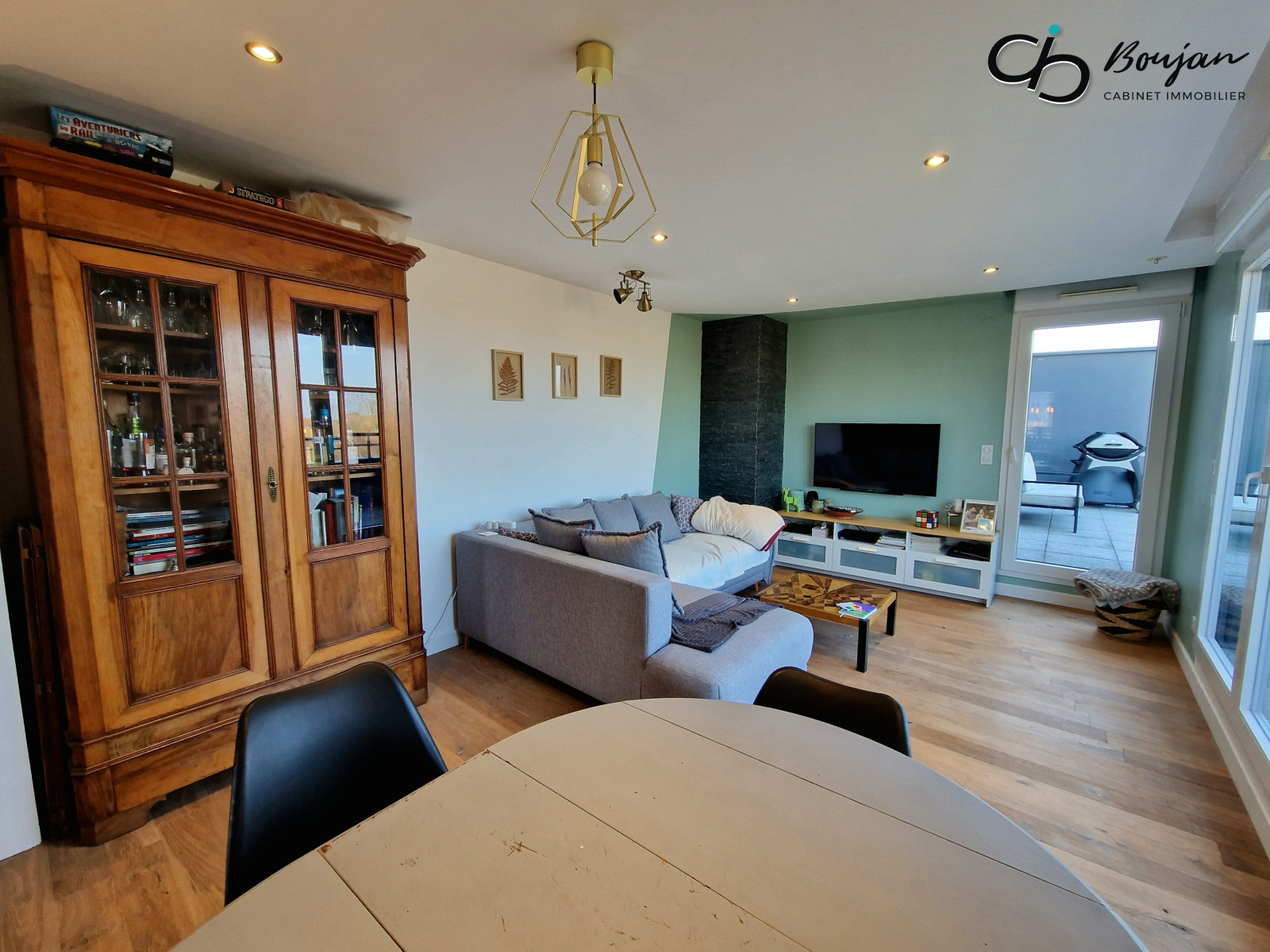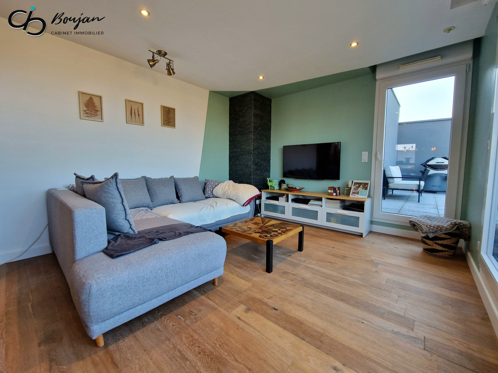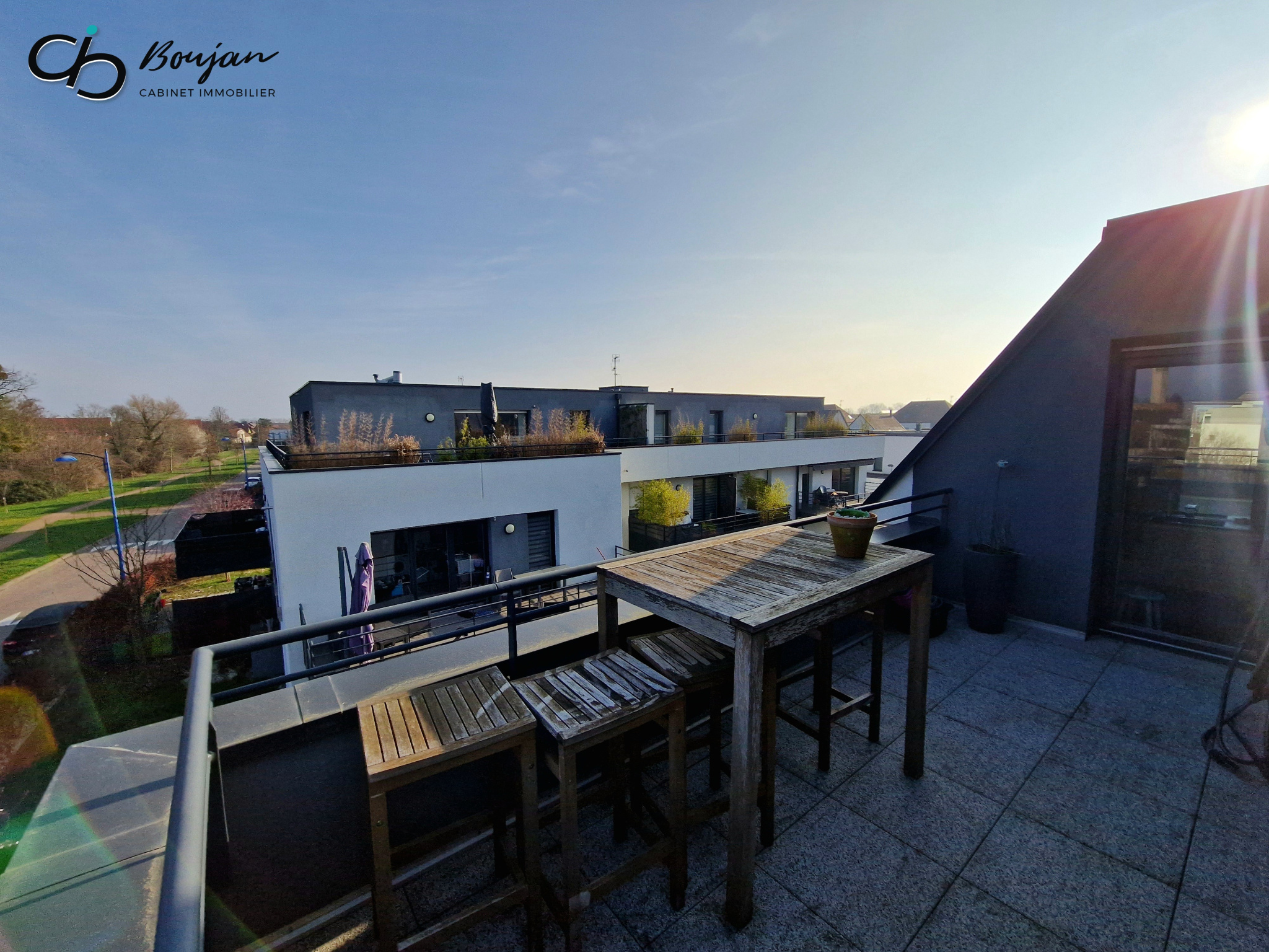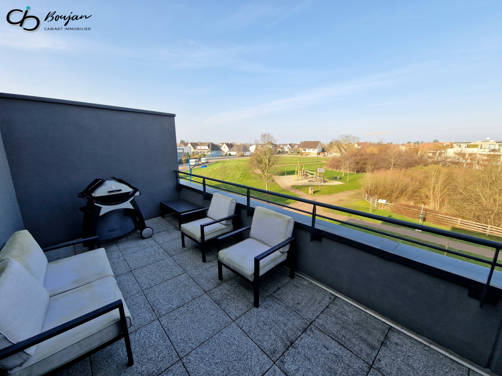 Évoquons enfin la terrasse de 31 m², avec une vue à 180° sur la verdure et les environs, sur laquelle vous pourrez profiter en toute discrétion de chaudes journées ensoleillées...