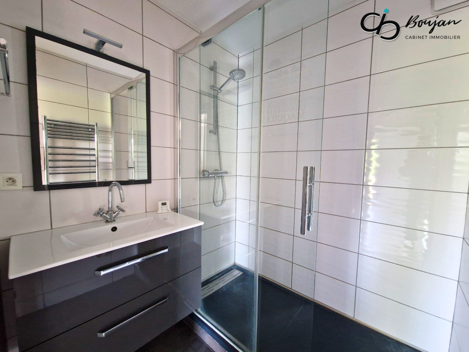 - une salle de bain entièrement carrelée avec douche, meuble vasque et sèche-serviette,